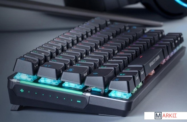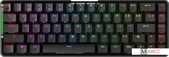 ROG Falchion: беспроводная механическая игровая клавиатура формфактора «65%» с 68 клавишами, подсветкой Aura Sync в беспроводном режиме, интерактивной сенсорной панелью, переключателями Cherry MX, со временем автономной работы до 450 часовКлавиатура без кириллицы.